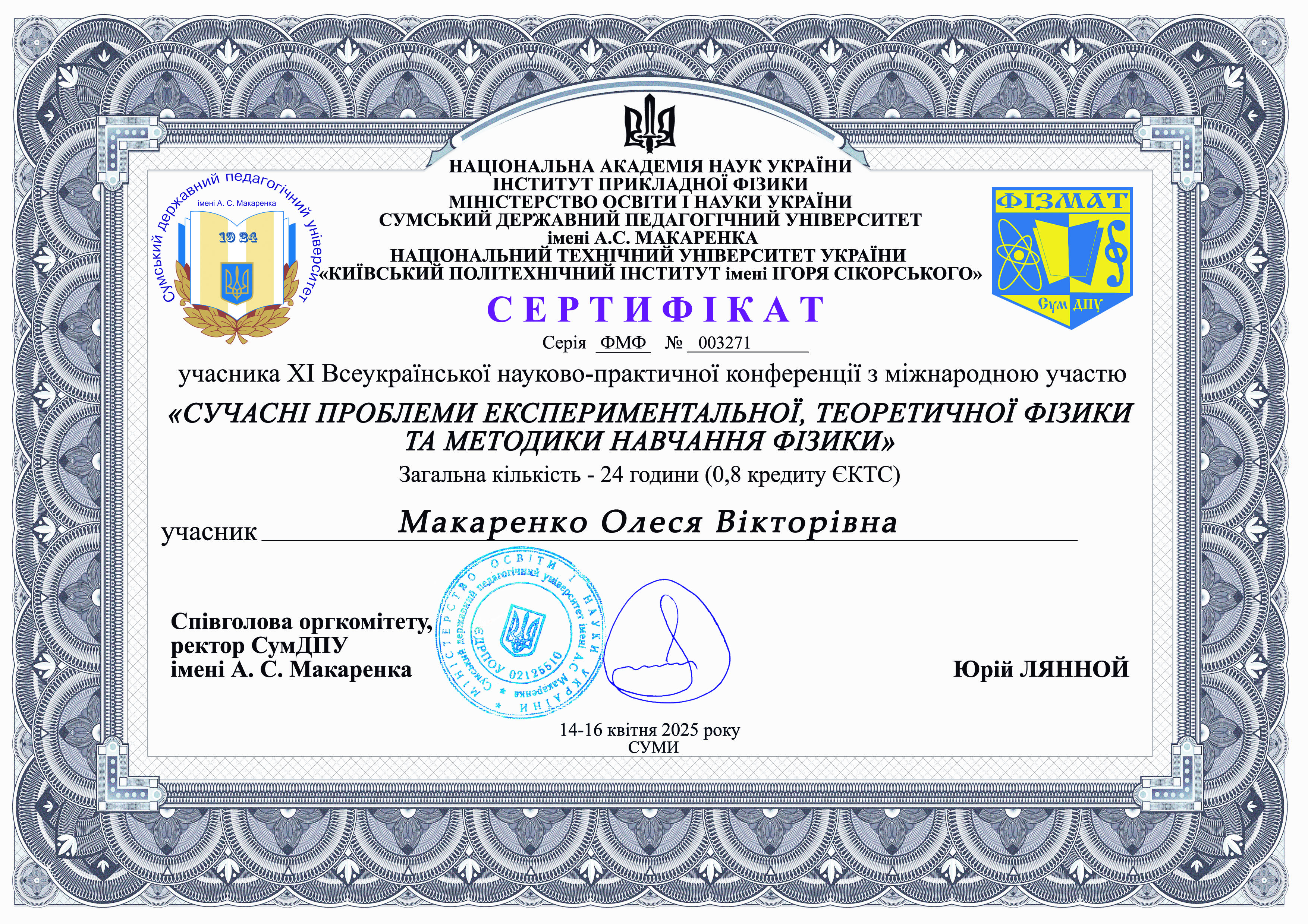 | Сертифікат учасника XI Всеукраїнської конференції з міжнародною участю СПЕТФ+МНФ 2025 | Посилання на файл |